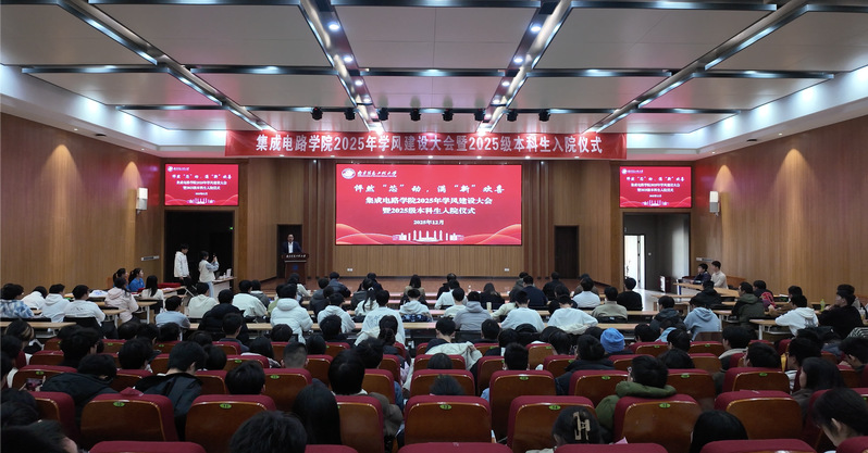 12月17日13点30分,集成电路学院在滨江楼报告厅举行2025年学风建设大会暨2025级本科生入院仪式。学院领导、全体新生及高年级优秀学生代表参加活动,大会由学院党委副书记、副院长王康宏主持。