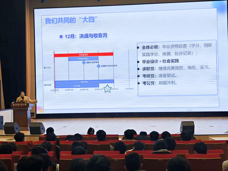 会议伊始,金红聚焦“毕业年的核心意义”,通过时间轴清晰梳理了2025年12月至2026年7月的关键节点,涵盖招聘黄金季、考研复试准备、公考冲刺、论文答辩等重要安排,强调全体学生需同步推进毕业资格自查、毕业设计与社会实践等事宜。针对毕业季常见风险点,会议重点解读了三条“高压线”。在学业与毕业资格方面,要求学生逐项核对总学分、模块学分及课程修读情况,紧盯补考重修机会,确保体测达标;在纪律与安全方面,重申宿舍安全要求,详解求职诈骗、网贷陷阱的防范技巧,关注毕业季心理健康,鼓励学生主动倾诉求助;在信息获取方面,明确学校就业网、教务处官网、年级群及辅导员为官方核心渠道,提醒学生杜绝信息屏蔽,避免错失关键机会。
