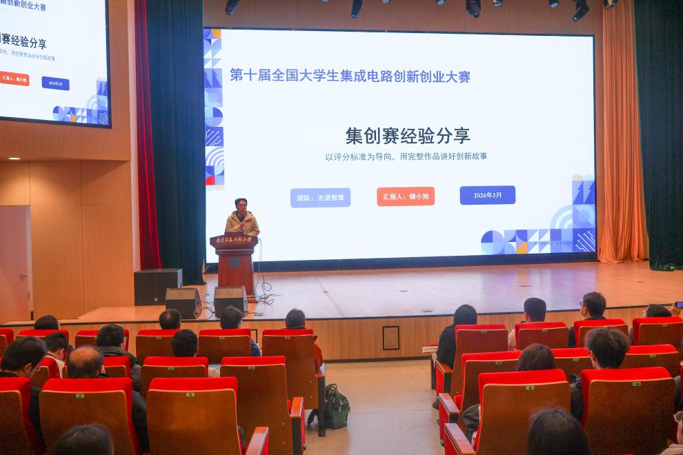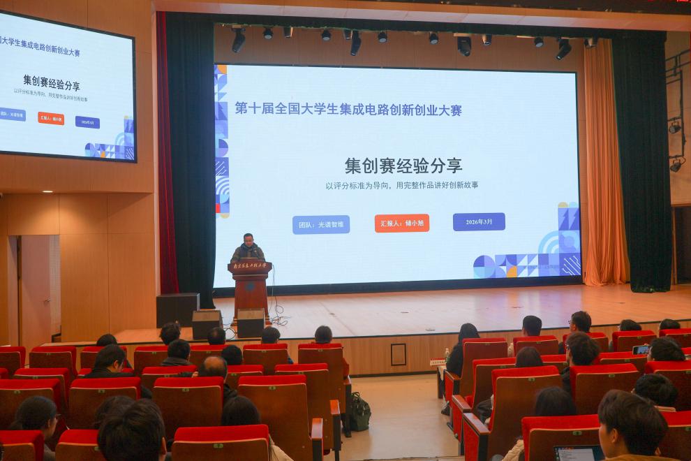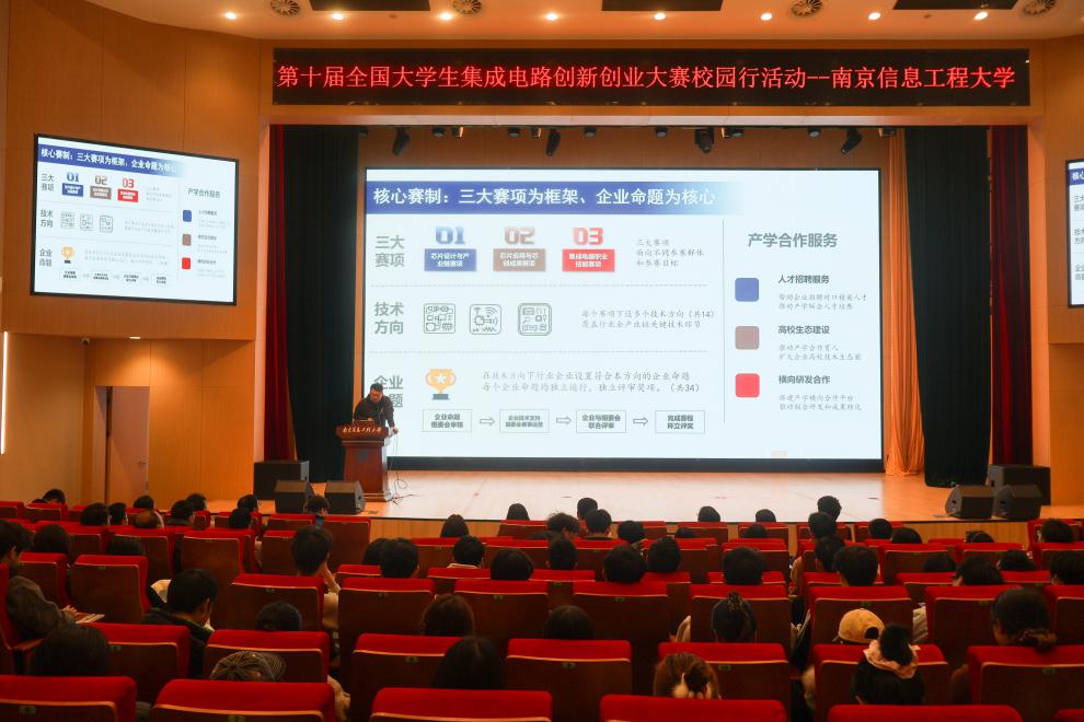为深化集成电路领域校企合作,搭建赛事交流与人才培养桥梁,帮助学生明晰竞赛赛道与备赛路径,3月14日,“第十届全国大学生集成电路创新创业大赛校园行”活动在南京信息工程大学临江楼D区报告厅成功举办。本次活动汇聚行业专家、企业代表与校内名师,为广大师生带来了一场兼具专业性、实用性与前瞻性的科创分享会。现场气氛热烈,近200名相关学院学生踊跃参与。
