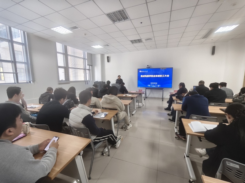 3月25日,集成电路学院2026年春季学期全体教职工大会在临江楼A104会议室召开。会议系统总结前期工作成效,深入分析发展面临的瓶颈问题,研究部署年度重点任务,进一步凝聚全院上下同心、奋发有为的思想共识。学院领导班子成员及全体教职工参加会议,会议由学院党委书记唐敏主持。